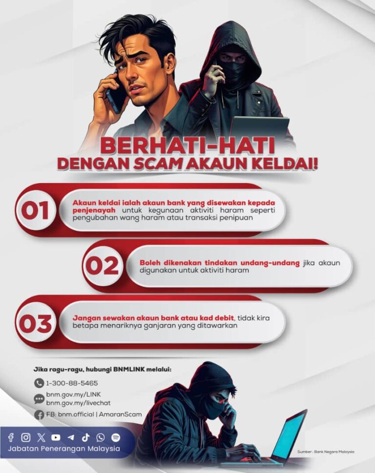 Jangan jadi mangsa sindiket akaun keldai! 🚫 Berhati-hati dengan setiap transaksi & lindungi maklumat peribadi anda.