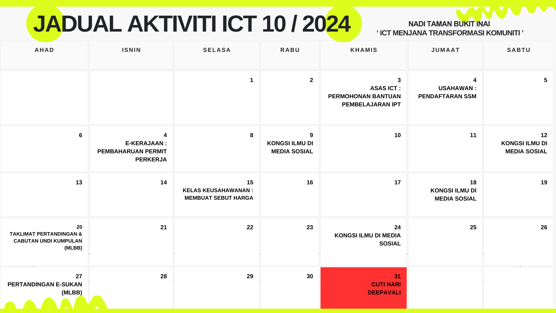 Tarikh : 16 Oktober 2024 (Rabu) Masa : Jam 2.00 Petang – 3.00 Petang Lokasi : NADI Taman Bukit Inai Peserta : Wanita Tujuan : Menyunting surat kebenaran dan menukarkan format surat daripada Word ke PDF. Aktiviti […]