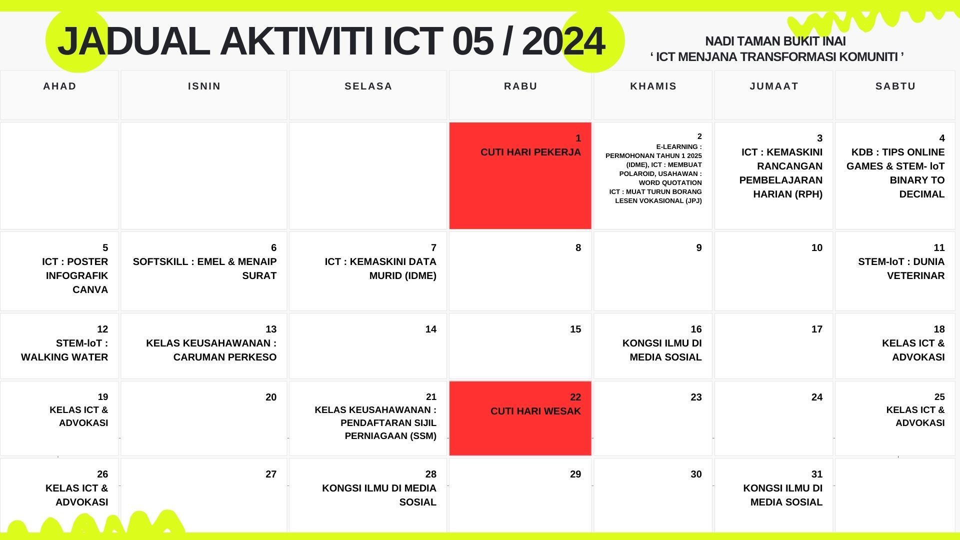 Tarikh : 13 April 2024 (Sabtu) Masa : Jam 02.30 Petang – 04.30 Petang Lokasi : NADI Taman Bukit Inai Peserta : Sekolah Rendah Tujuan : Untuk memberi tunjuk ajar kepada pelajar tentang cara membuat poster Kawasan […]