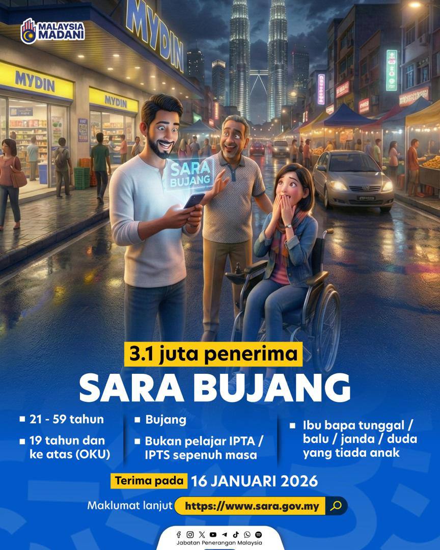 3.1 juta penerima SARA Bujang bakal menerima bantuan mulai16 Januari 2026. Kerajaan terus prihatin, memastikan tiada rakyat yang tercicir. Sumber infografik: @japenmalaysia