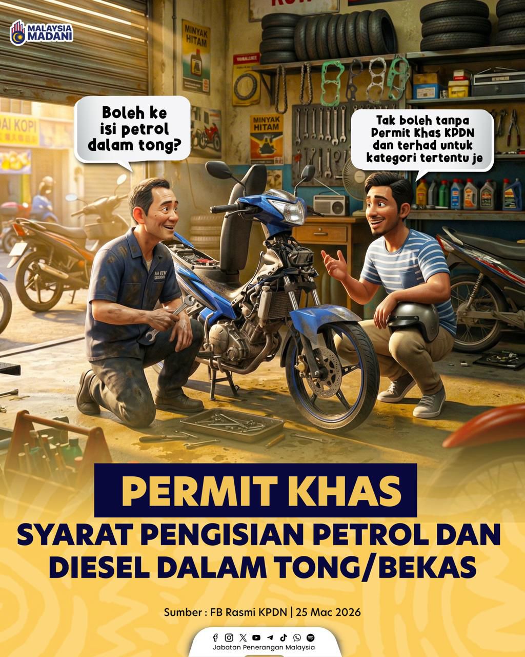 Sumber: Jabatan Peneranganhttps://whatsapp.com/channel/0029VaCrdip8vd1I8unvfy2h/5547 SYARAT ISI PETROL & DIESEL DALAM TONG/BEKAS β½π’οΈ πΉ Hanya dibenarkan dengan Permit Khas sah. πͺͺπΉ Mohon secara online: https://spb.kpdn.gov.myπΉ Situasi kecemasan: maksimum 20 liter sahaja. β οΈπΉ Patuhi peraturan untuk elak tindakan undang-undang. βοΈ