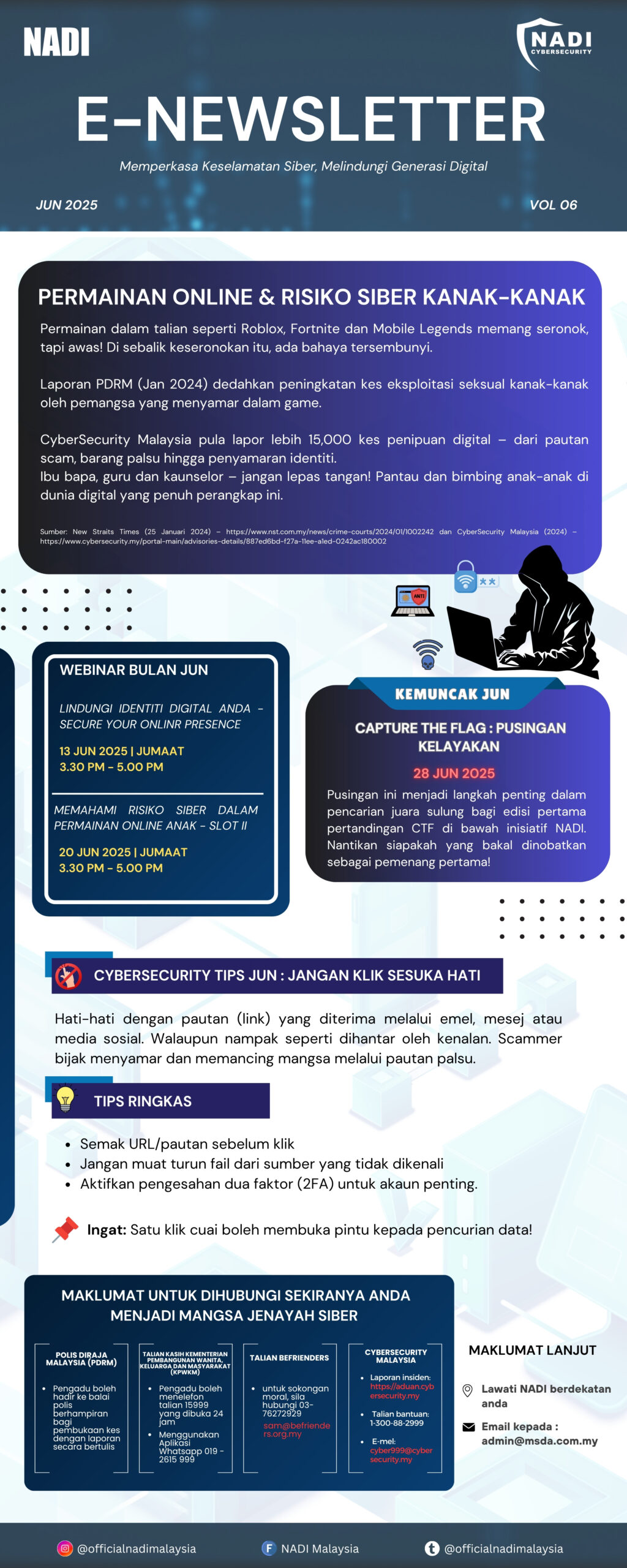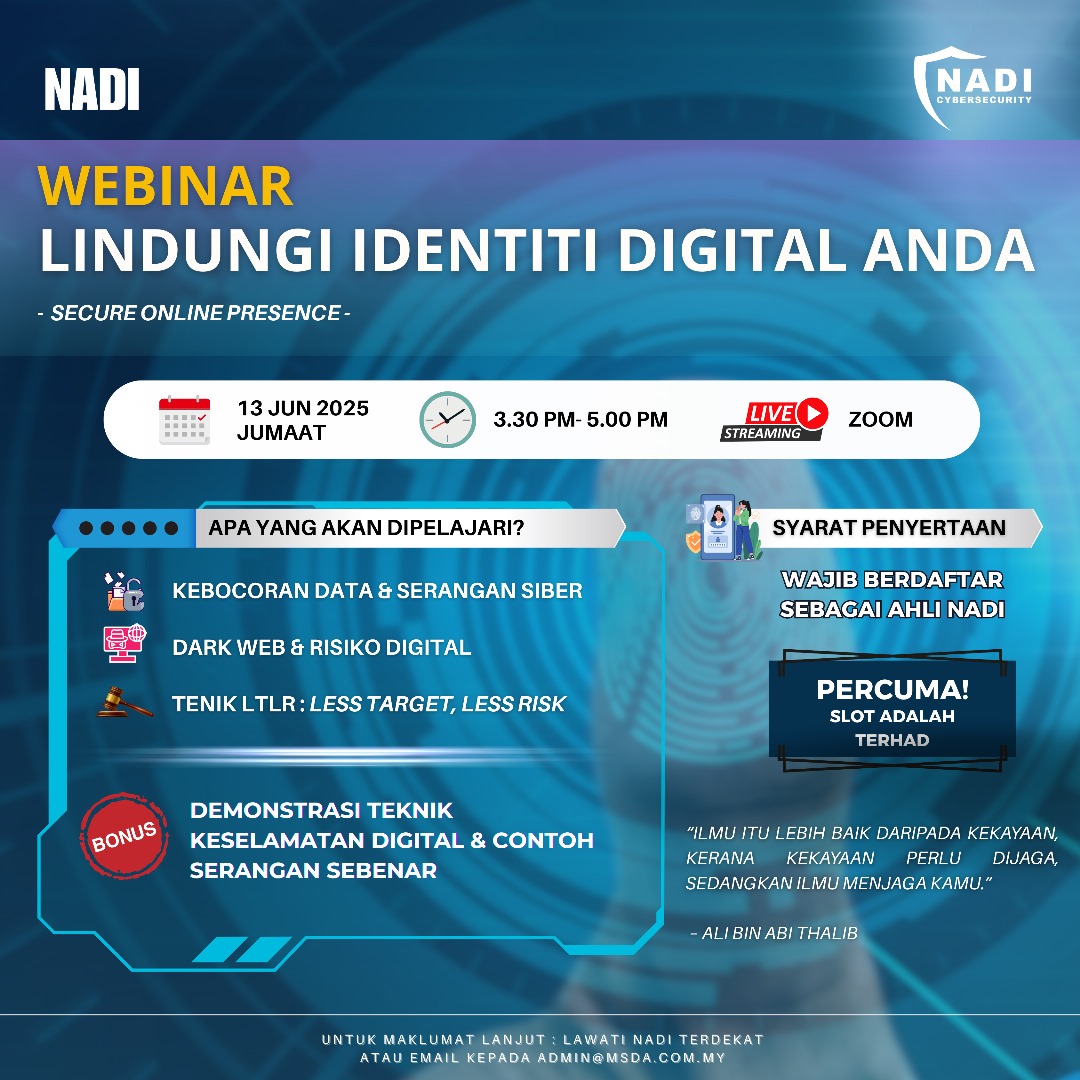 π 13 Jun 2025 (Jumaat)π 3.30 PM β 5.00 PMπ» Platform: Zoom (Live Streaming)π Pautan Pendaftaran: cybersecurity.nadi.my π Antara yang akan dipelajari:π Kebocoran Data & Serangan Siberπ Dark Web & Risiko Digitalπ― Teknik LTLR: Less Target, Less Riskπ§ Bonus: Demonstrasi […]