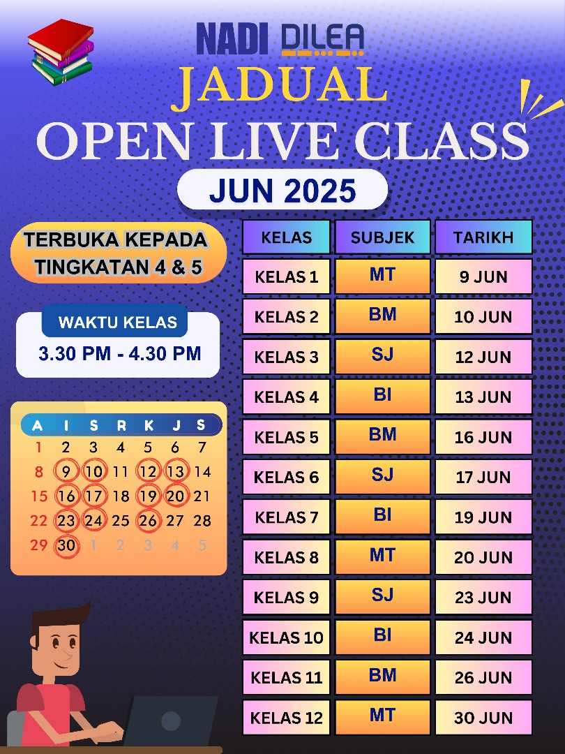 β¨ Eh betul ke DILEA dah buka OPEN LIVE CLASS? π± Ya, betul! π±π Sekarang semua pelajar Tingkatan 4 & 5 boleh join live class bermula 9 Jun 2025 β secara PERCUMA dan tidak perlu daftar! π Bermula 9 Jun […]