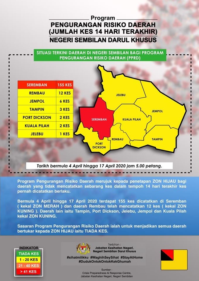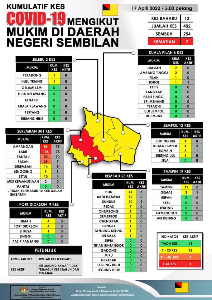 Sehingga 17 April 2020 jam 5.00 Petang, sebanyak 13 KES BARU POSITIF COVID-19 telah dilaporkan ke CPRC, JKN Negeri Sembilan menjadikan keseluruhan jumlah kes COVID-19 adalah sebanyak 402 KES.
