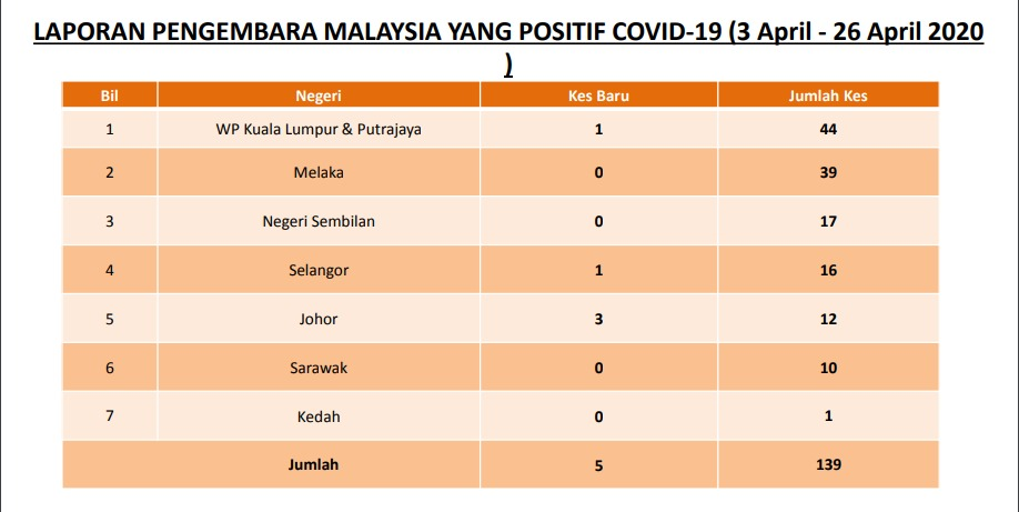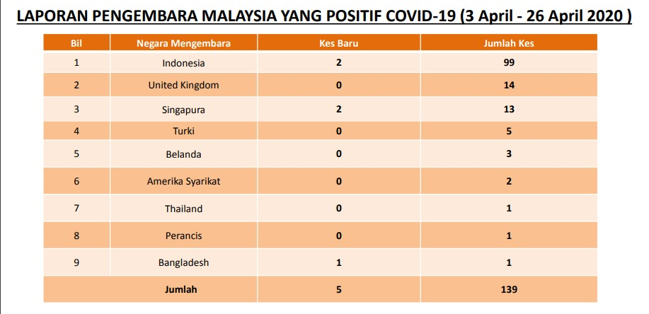 Seramai 139 orang didapati positif COVID-19 (1.1peratus). Daripada jumlah positif COVID-19 tersebut, negara yang telah dilawati adalah: 99 kes melawat Indonesia, 14 kes melawat United Kingdom, 13 kes telah Singapura, 5 kes melawat Turki, 3 kes melawat Belanda, 2 kes melawat Amerika Syarikat, 1 kes masing-masing melawat Thailand, Perancis dan Bangladesh.