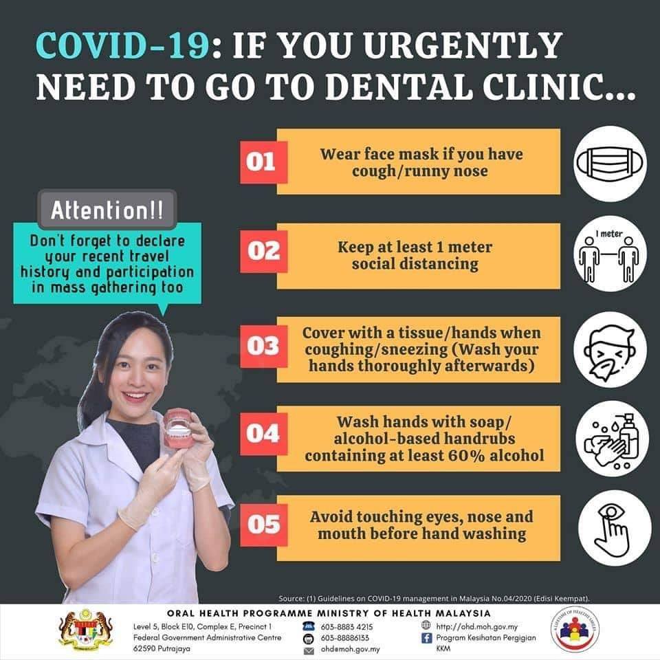Jika perlu untuk berjumpa doktor gigi, amalkan norma-norma baharu termasuklah pemakaian pelitup separuh muka.